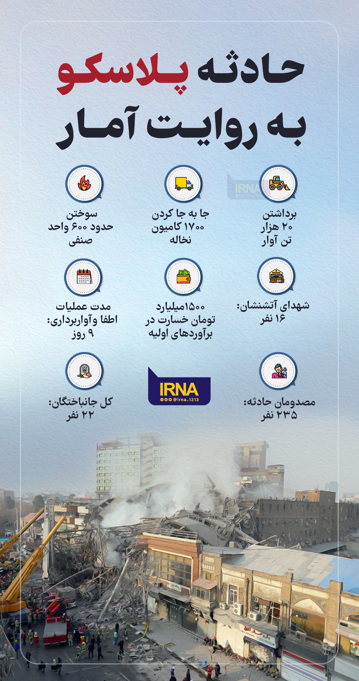 تهران- ایرنا-سی ام دی ماه سال ۹۵ یادآور روز تلخی برای ایرانیان است؛ حوالی ساعت ۱۱ صبح، ساختمان در حریق گرفتار شده پلاسکو، بر روی جان و سرمایه مردم فروریخت و ۱۶ آتش نشان در راه نجات هموطنان خود شهید شدند. در این اینفوگرافیک این حادثه را به روایت آمار ببینید.